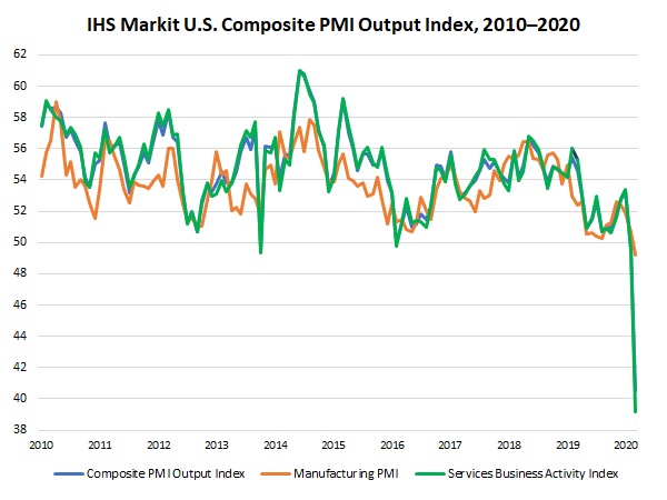 - With many consumer-facing businesses closed and more Americans staying closer to home, the IHS Markit Flash U.S. Services Business Activity Index declined from 49.4 to 39.1, a record low. Service-sector activity also plummeted to new all-time lows in the Eurozone and in the United Kingdom in preliminary data.