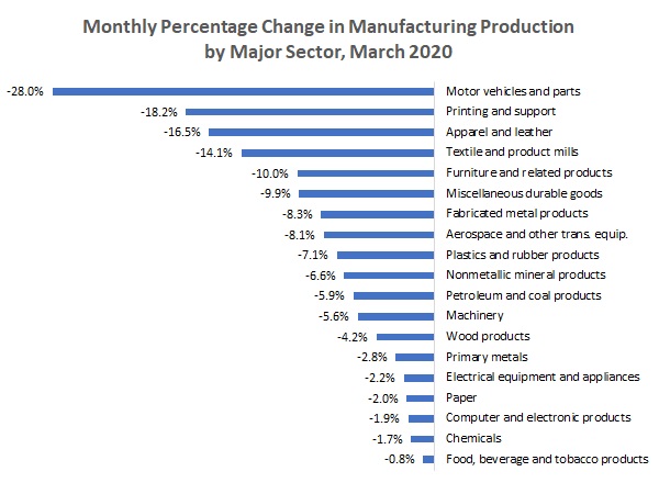 - Manufacturing production fell sharply by 6.3% in March as firms grappled with the COVID-19 outbreak, including closures, reduced activity and significant supply and demand disruptions globally. Durable and nondurable goods production decreased 9.1% and 3.2% in March, respectively, with all 19 major sectors experiencing declines (see the graphic below).